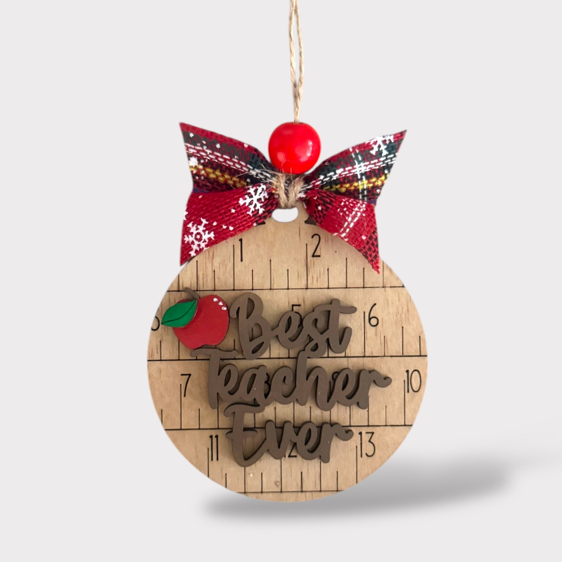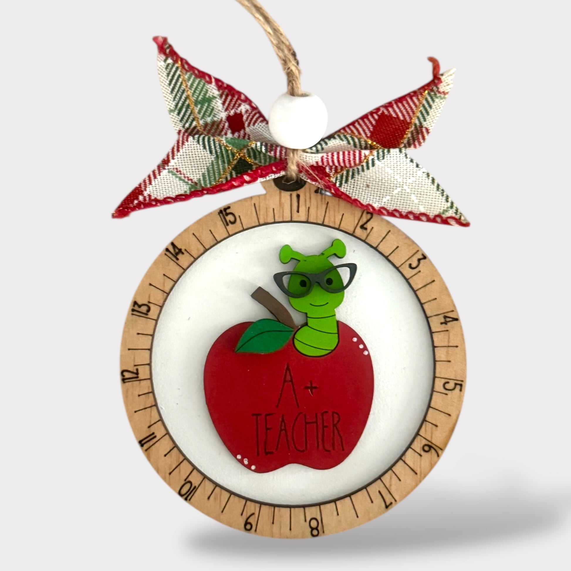 Celebrate your favorite educator with a charming wooden keepsake! These ornaments feature a classic ruler design, vibrant red apples, and an adorable spectacle-wearing bookworm. Choose from four thoughtful styles, including "Best Teacher Ever," "A+ Teacher," or designs marking the year 2025. Each piece comes ready to hang with a festive bow or beaded accent, making it the perfect heartfelt thank-you gift for any teacher, tutor, or school staff member.