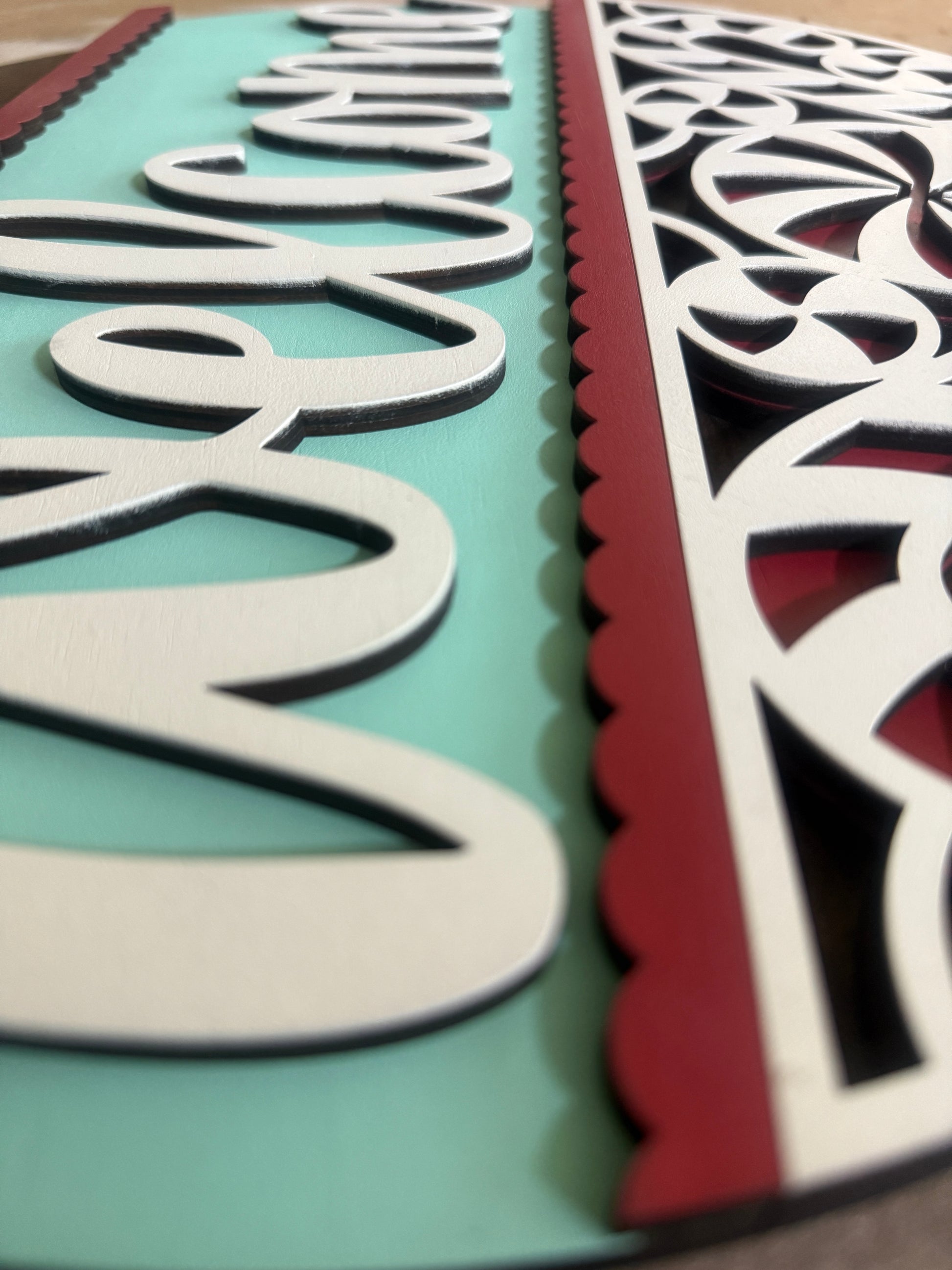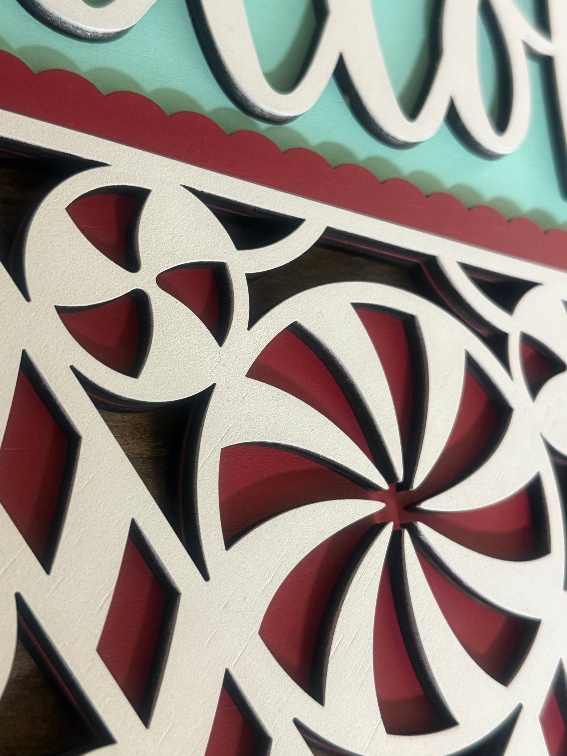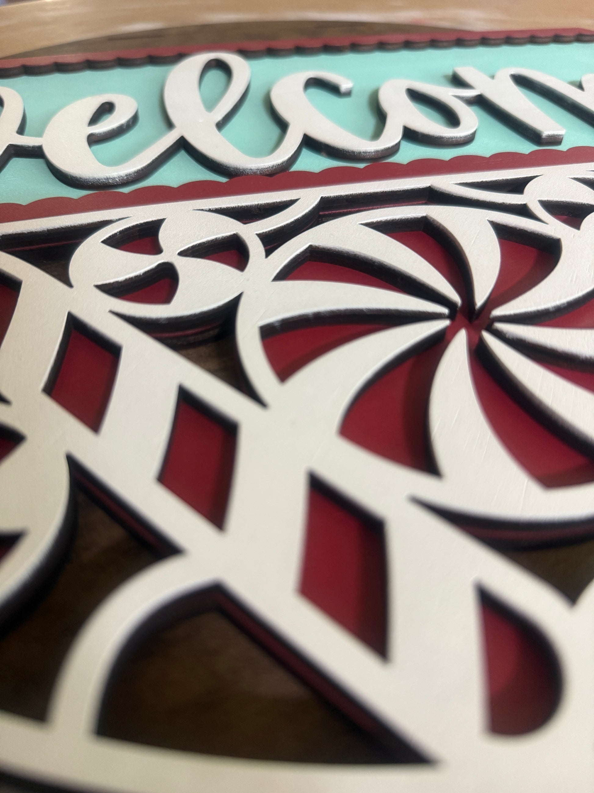 This unique piece is laser-cut from wood and lovingly hand-painted with a vibrant mint background, rich burgundy accents, and intricate candy cane designs. It's the perfect 16-inch round design for front doors or walls, offering durable, high-quality craftsmanship built to last. Add a touch of handcrafted holiday charm to your home – it's ready to hang!